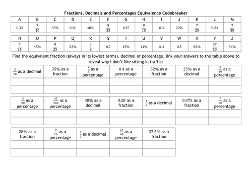 Fractions Decimals Percentages Equivalence Codebreaker Teaching Resources